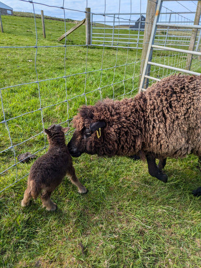 Shetland Sheep are great mothers, they have not been intensively breed with larger sheep so they are easily able to give birth to their lambs, we almost never have to intervene to pull out a lamb that is struggling to be born. Compare this to a commercial breed south where the farmer might be assisting in 15% of lambings. A shetland sheep lambing is a lovely calm experience for all involved.