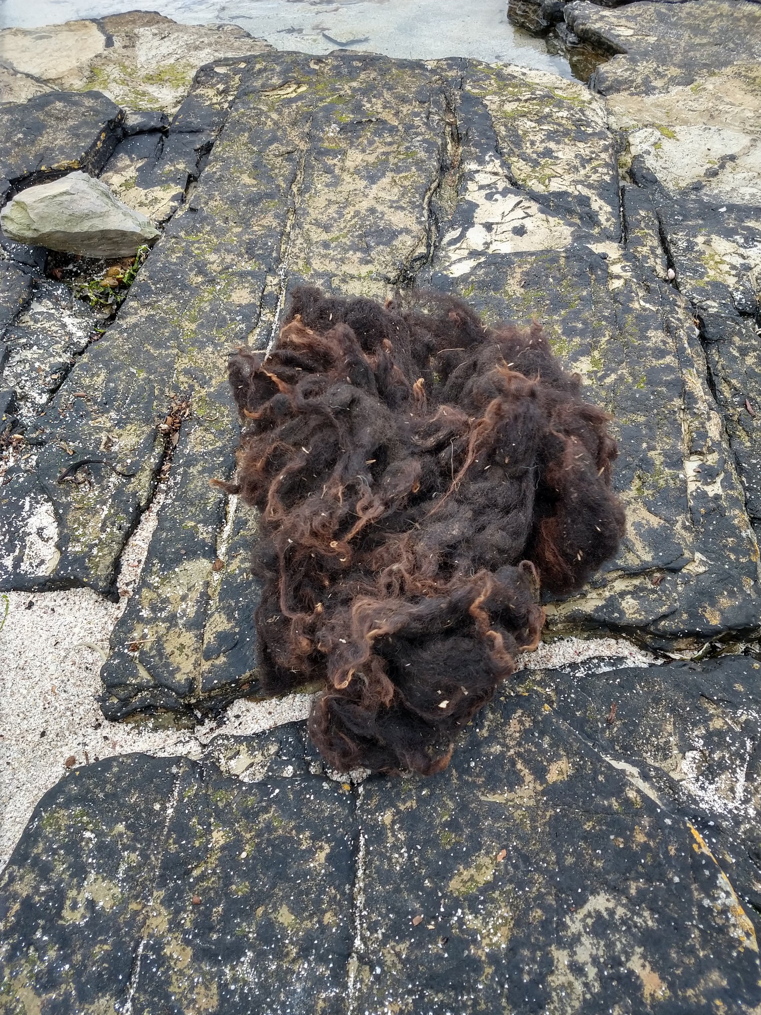 The fleece is from a Black Ewe Hogg, and the tips of the wool have been lightly bleached by the sun.
